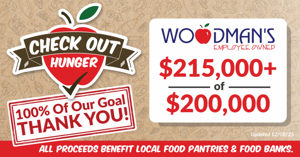 Customers can donate to the Check Out Hunger Campaign from November 1st through December 31st. Customers may add a donation of $1, $3 or $5 to their order total when checking out at any Woodman’s location.